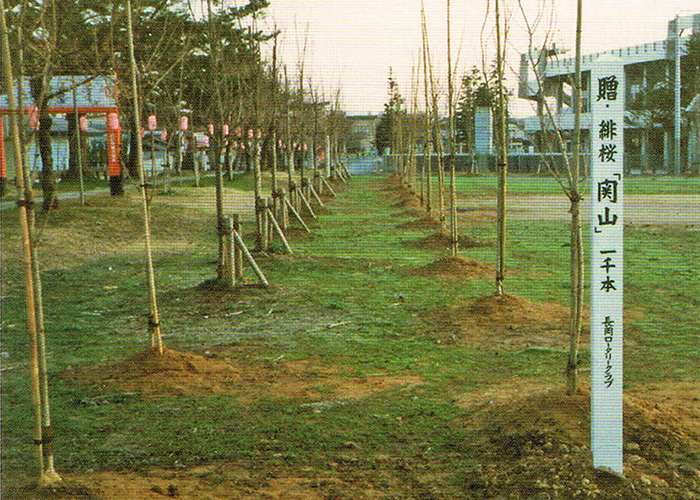 長岡ロータリークラブは、「地域を愛し地域とともに歩む」という理念のもと、さまざまな奉仕活動を展開してきました。1985年から1989年にかけては、悠久山公園に八重桜を植栽し、「お山の千本桜」の復活を目指しました。また、長岡駅東口の植樹帯整備や、県立歴史博物館前に縄文のモニュメント「過去への門」を建立するなど、地域の景観向上と文化発信にも寄与しています。